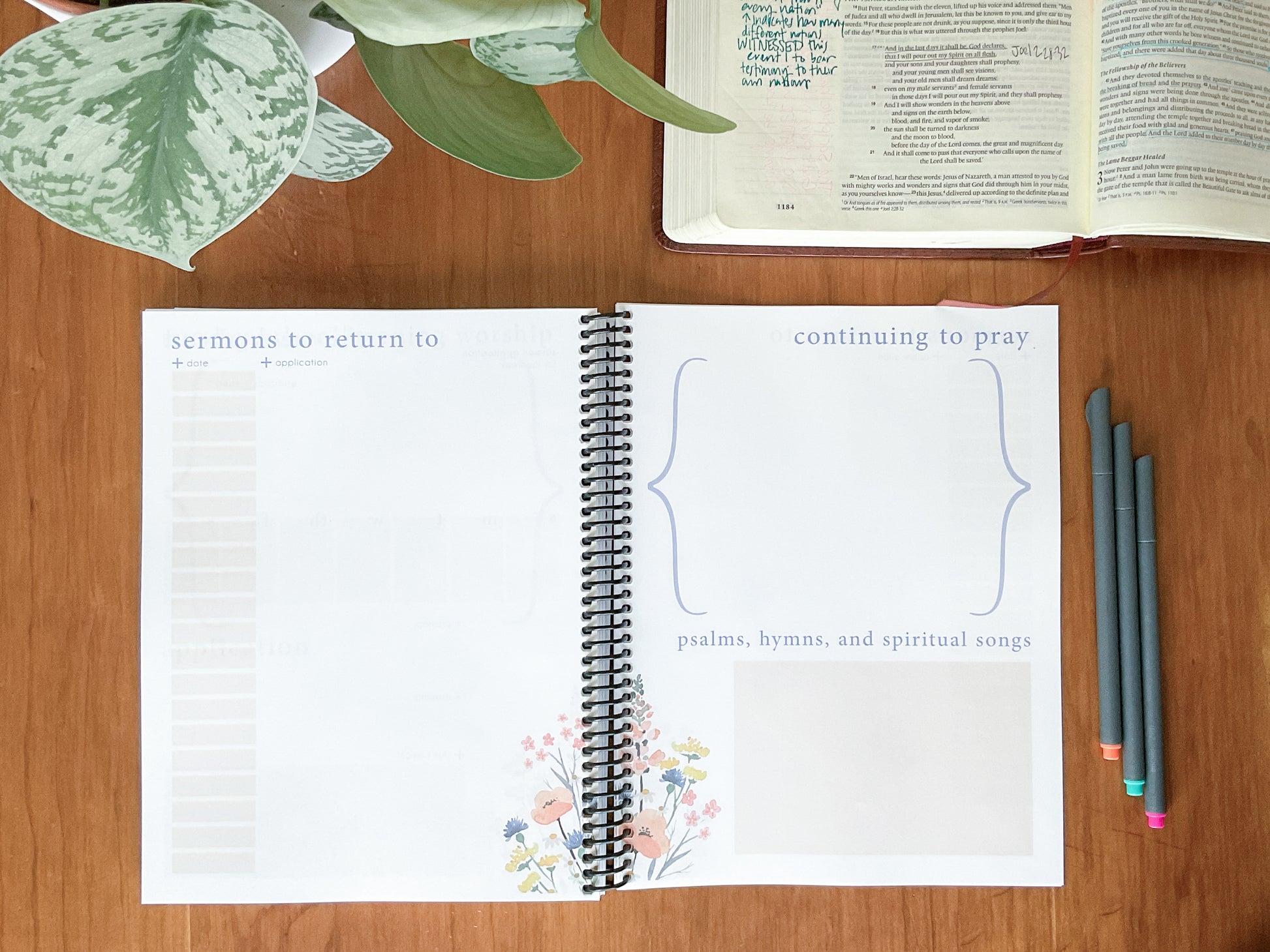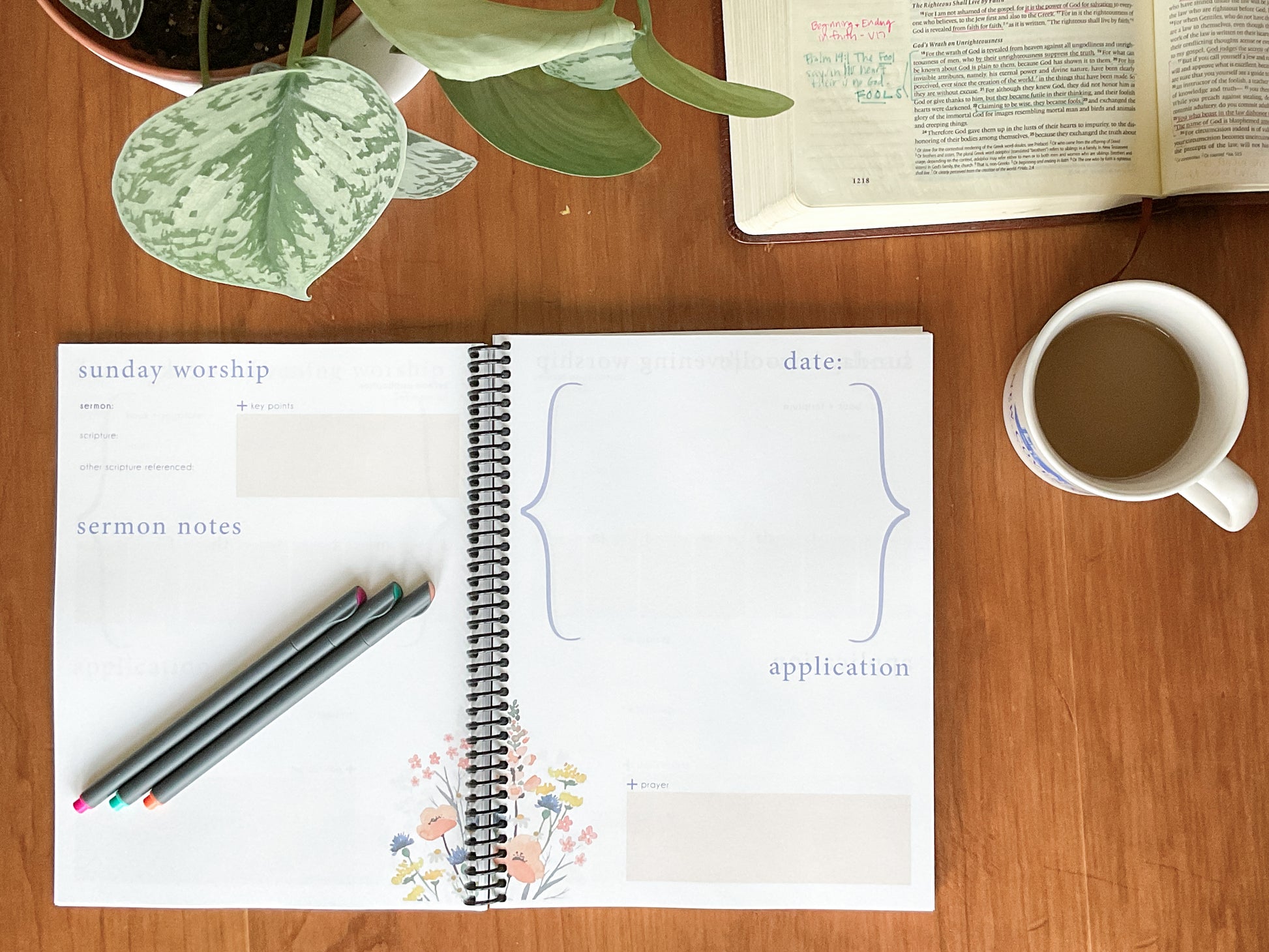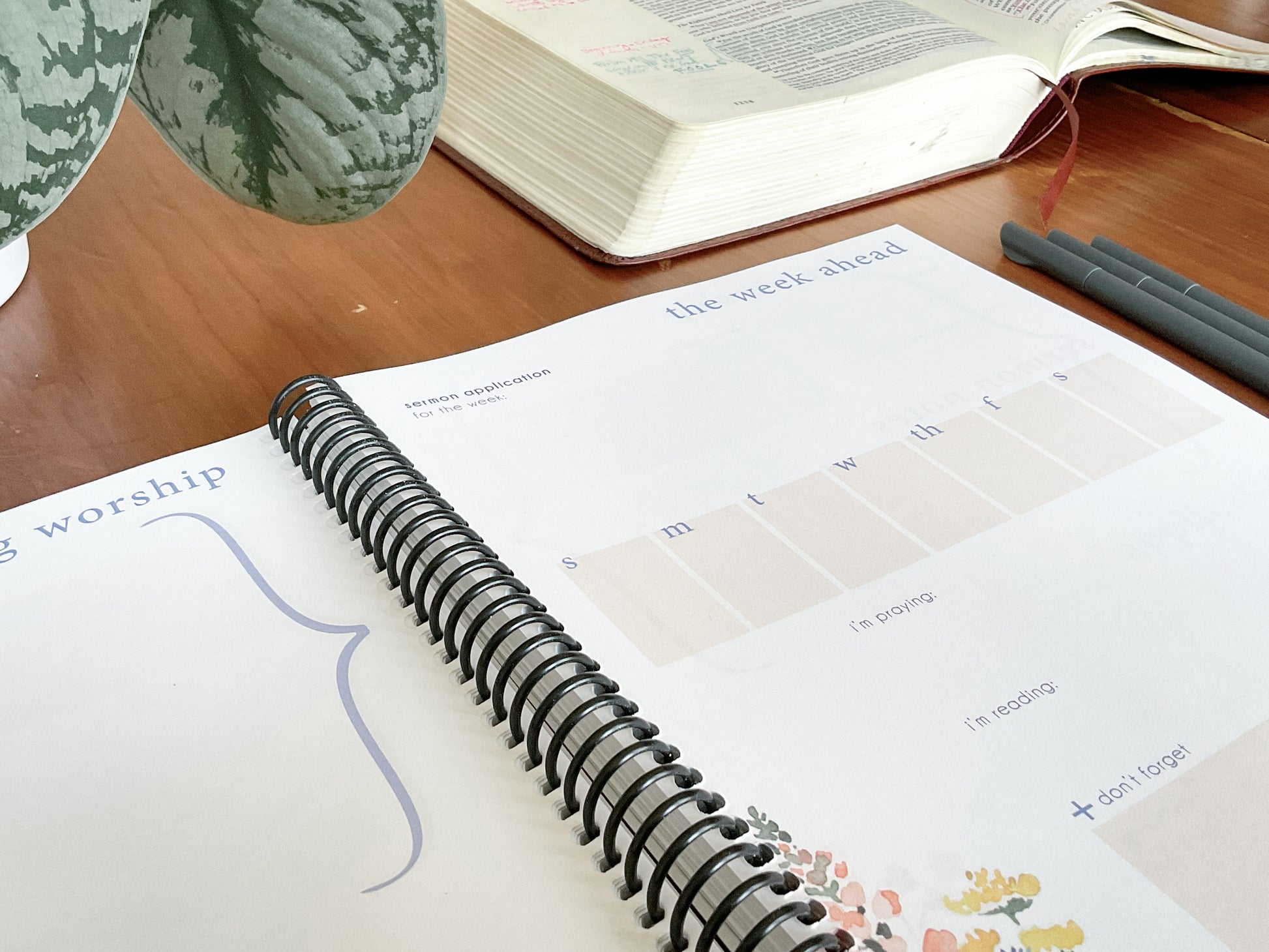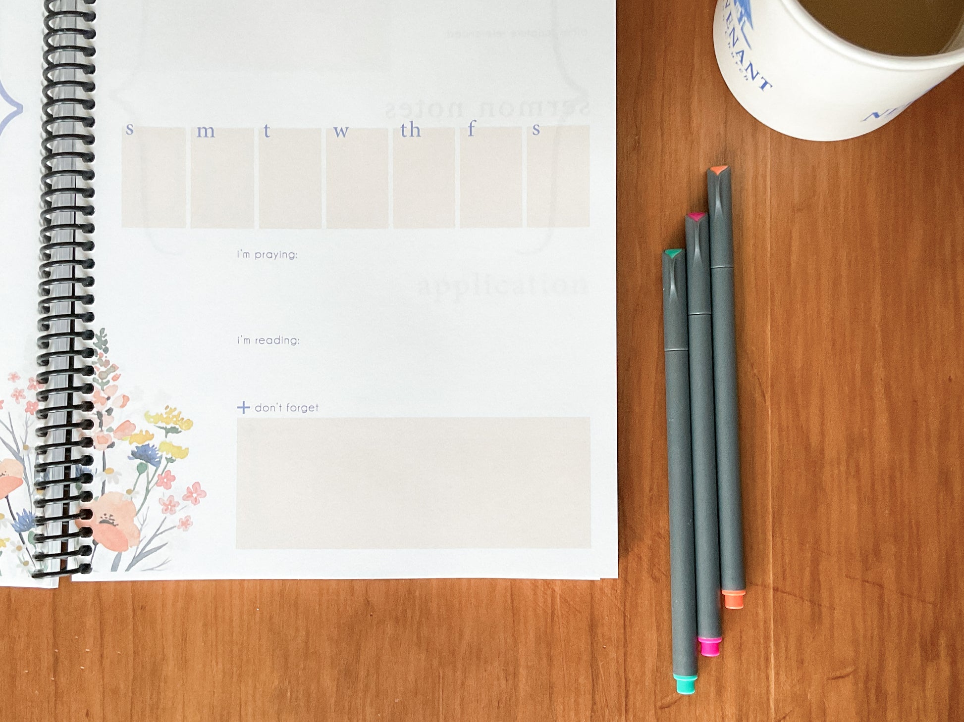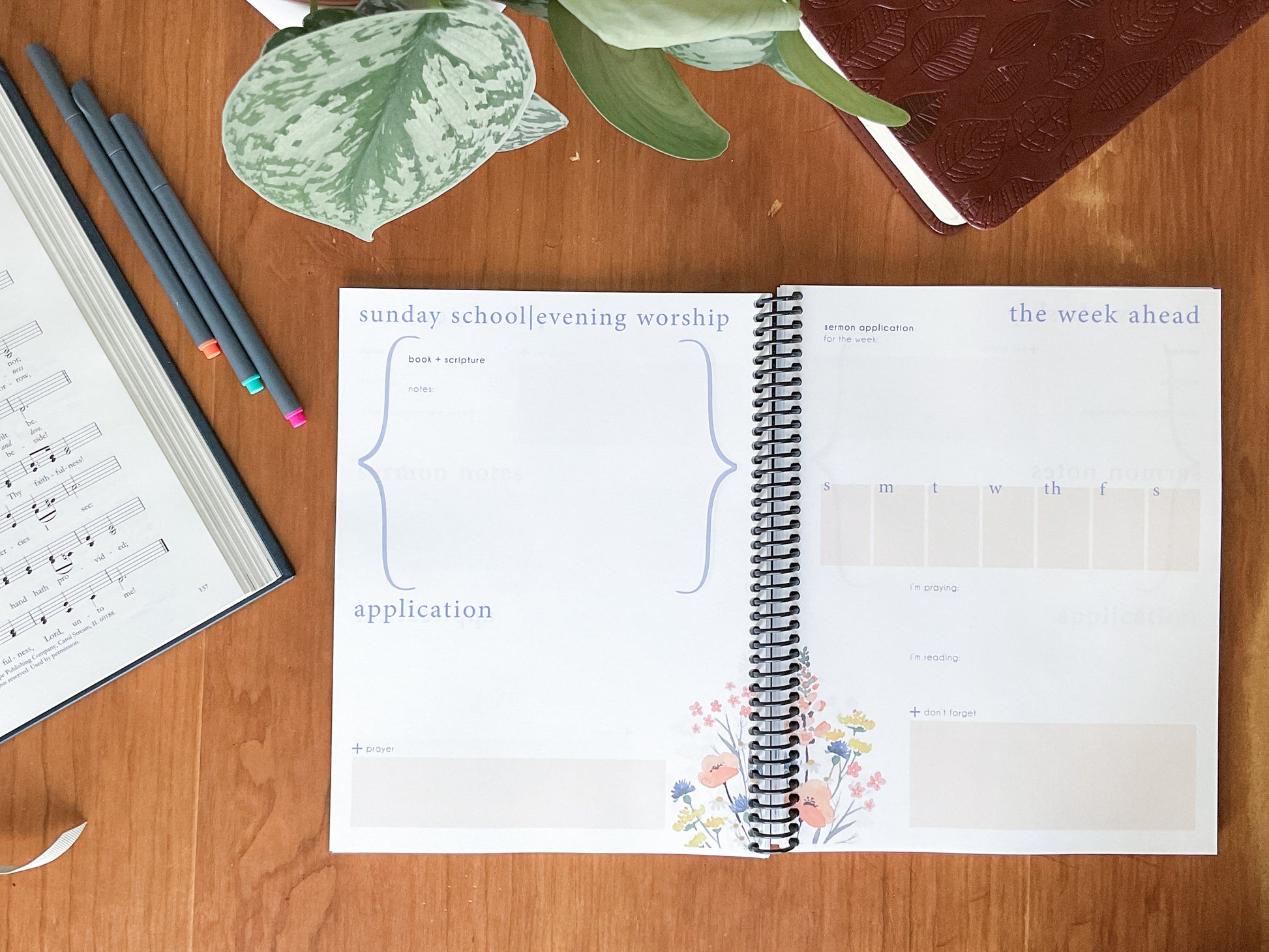 - a Sunday planning page to record what you'll remember from your time at worship, who and what you'll intentionally spend time in prayer over, and other general planning tools for the week ahead